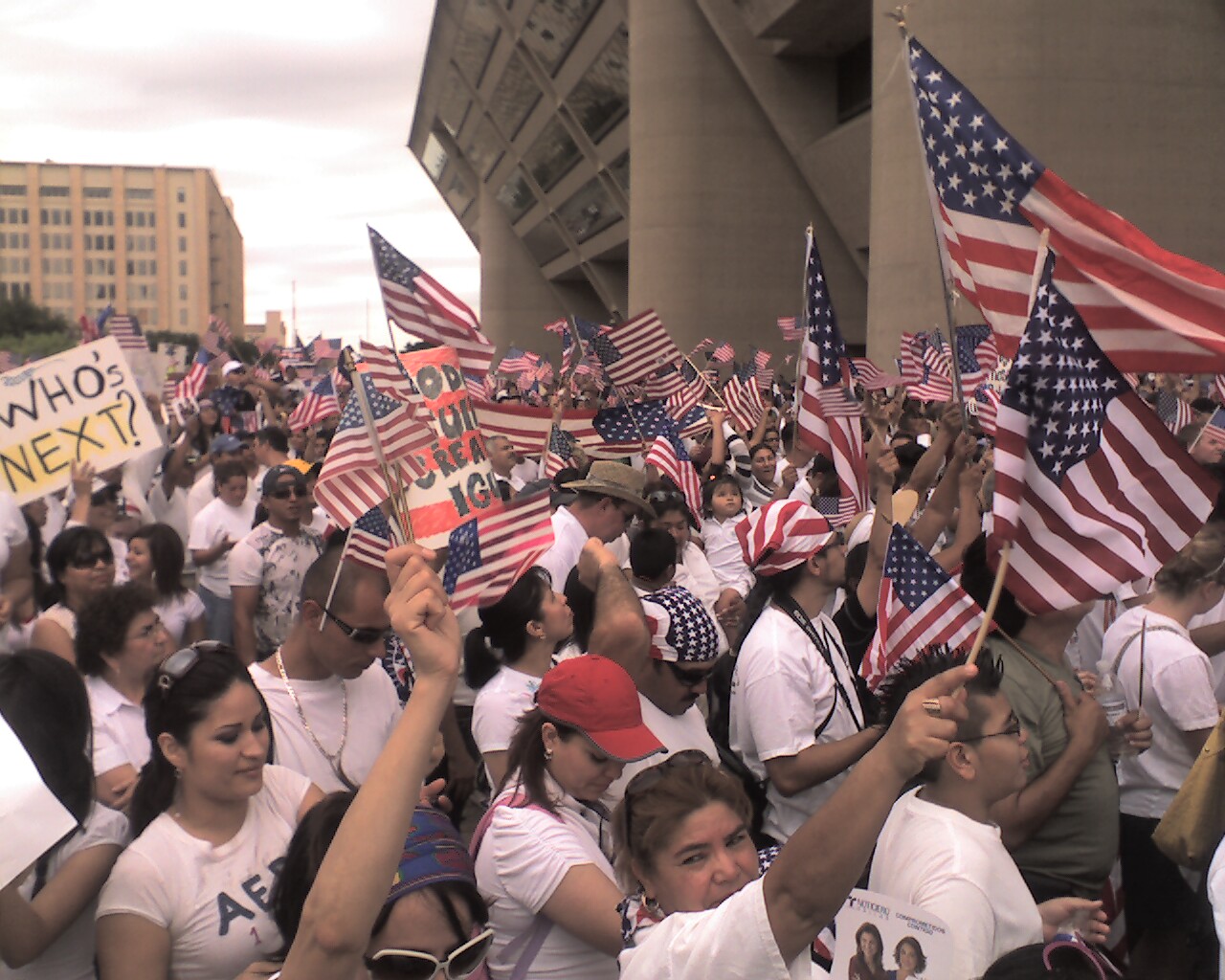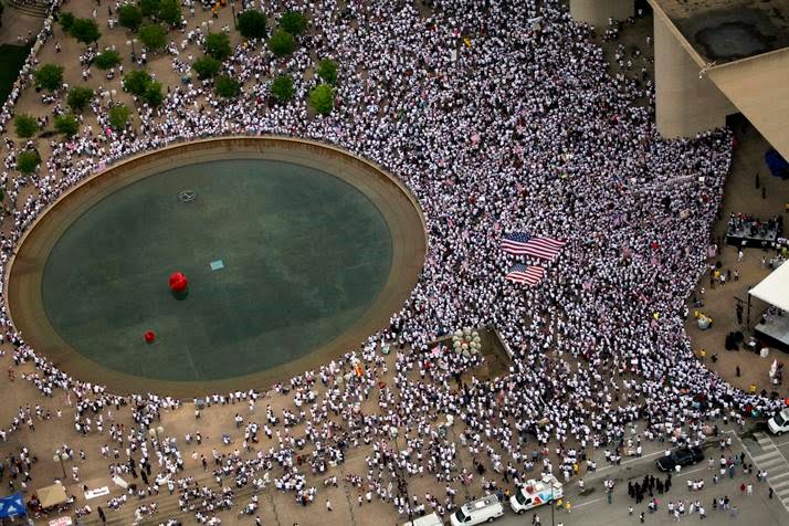 Tens of thousands of people wearing white shirts and waving thousands of American flags. Immigrants and citizens standing together, with a common and positive message advocating for the inclusion of all people. Tens of thousands of people marched; and just like last time, not ONE arrest! Marchers even brought their own trashbags to pick up after themselves..and the city, last time, commended the marches for how neat and clean they left the parade route.