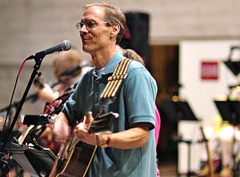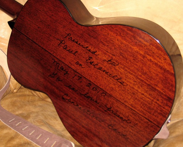 Two weeks ago, we had a “farewell” party with our Connections band members over at our house. Ostensibly, it was to say goodbye; but unbeknownst to Paul, it was also to present him with this guitar…