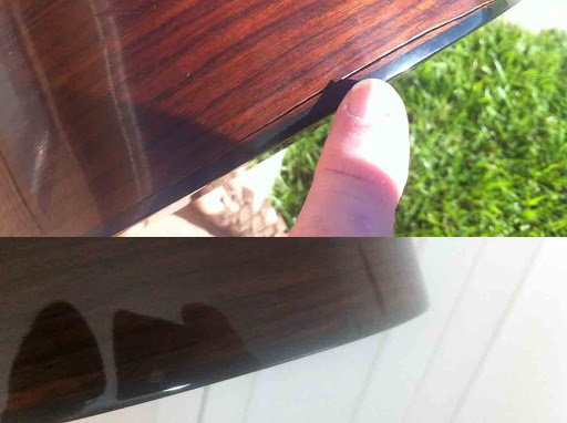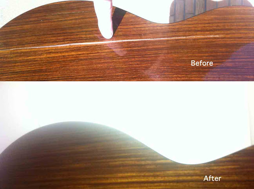 Here’s the same crack from at the very bottom of the guitar. As you can see, it didn’t just split right along the wood. But they fixed that too: