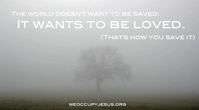 Any saving of the world begins with acts of love. Loving the world is what God does. Sending God’s Son INTO the world. (Get ready: Christmas is coming!)