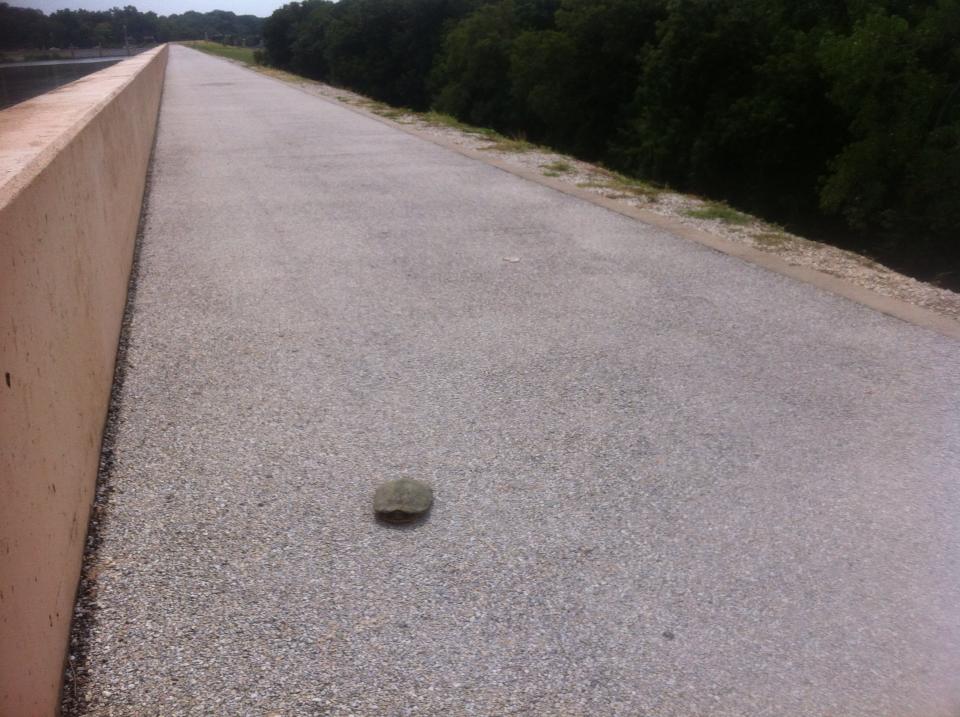 I’ve named him “The Sisyphus of White Rock Lake.” I’ve seen this same thing three or four times on rides this year. Best I can tell, these little guys climb all the way up the grassy side of the dam. In fact, today I saw this guy the first time around. He was gone by my second lap. But later on my third, an entirely different turtle was trying the same thing about 200 feet South towards the spillway.