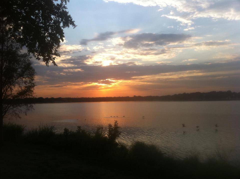 Take today, for example. When I started out about noon, it was overcast and (I kid you not) cool. In the 70s, which is unheard of this time of year. The lake itself by was pure green glass. No wind at all. No lapping waves anywhere around the shore for the first three laps. Wish I’d stopped to take a shot of that. (Here’s an awesome sunset from last year instead…)