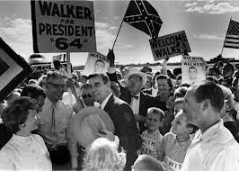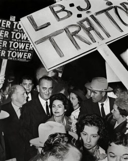 Here you see a picture of Congressman Bruce Alger in 1960 in downtown Dallas…Dallas’ ultra-conservative Congressman…holding up a sign claiming that LBJ had given in to socialism.