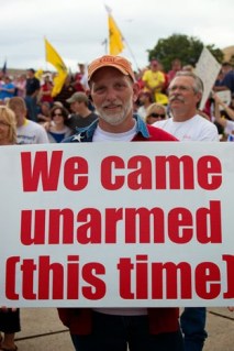 But Tea Party rallies around the nation continue to draw news coverage, whether or not they draw big crowds. And sometimes their signs look like this: