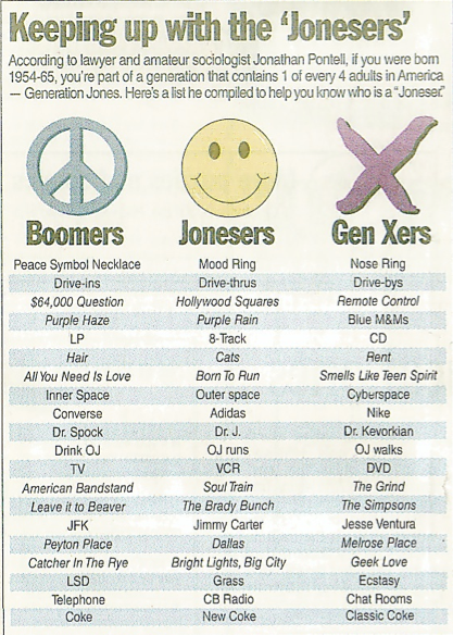 Hell, the whole point of this essay is to point out how most of the folks, on either side of us, don’t even understand that we are a “thing.” Most of us don’t understand it either. But when “Generation Jonesers,” themselves are first shown the evidence for our group, they almost always say something like “this explains everything that’s always been confusing about my life….”
